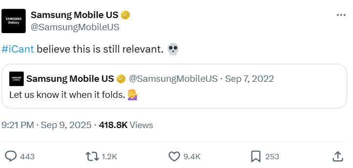 في خضم موجة الإعجاب بالمنتجات الجديدة، استعادت سامسونج تغريدة نشرتها عام 2022 وقت إطلاق آيفون 14، جاء فيها: "أخبرونا عندما يكون قابلا للطي!"، في إشارة إلى أن آبل متأخرة في دخول مجال الهواتف القابلة للطي حتى الآن، رغم ابتكاراتها الأخرى.