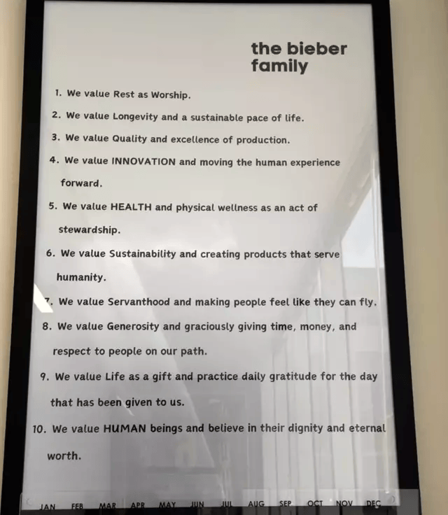 القائمة، التي حملت عنوان "عائلة بيبر" أو "The Bieber Family"، تضمنت المبادئ الآتية: