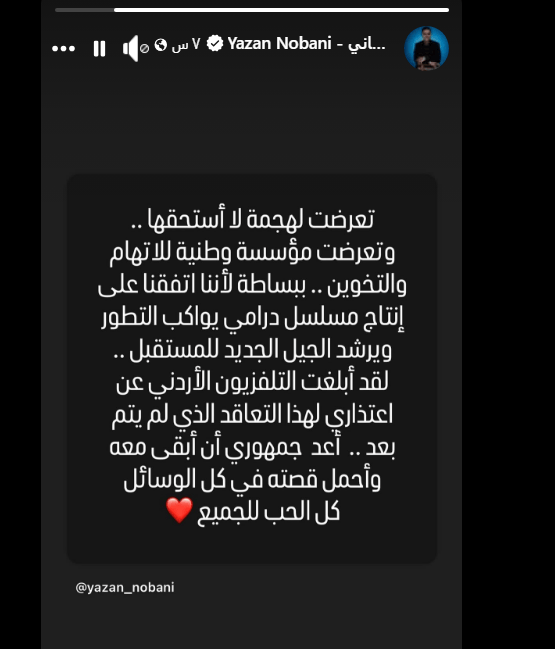 يزن النوباني يعتذر عن مسلسل التلفزيون الأردني بعد الجدل حول قيمة العقد!