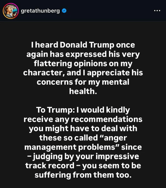 في المقابل، ردت غريتا تونبرغ عبر حسابها في "إنستجرام" بسخرية لاذعة، قائلة: "سمعت أن دونالد ترامب عبّر مجددًا عن آرائه اللطيفة في شخصي، وأنا أقدر قلقه على صحتي النفسية. وأود أن أطلب منه نصائح حول كيفية التعامل مع مشكلات الغضب، فهو بالتأكيد يملك خبرة طويلة في هذا المجال".