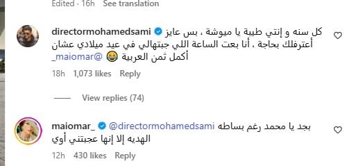 لكن سامي لم يفوّت الفرصة لإضافة لمسة من روح الدعابة التي تميّز علاقته بزوجته، إذ كتب في تعليق طريف أنه اضطر إلى بيع الساعة التي أهدتها له في عيد ميلاده السابق ليكمل ثمن السيارة. لترد عليه مي بمزاح مشابه قائلة إن «الهدية بسيطة لكنها جميلة»، في مشهد يعكس الانسجام المعروف بين الثنائي.