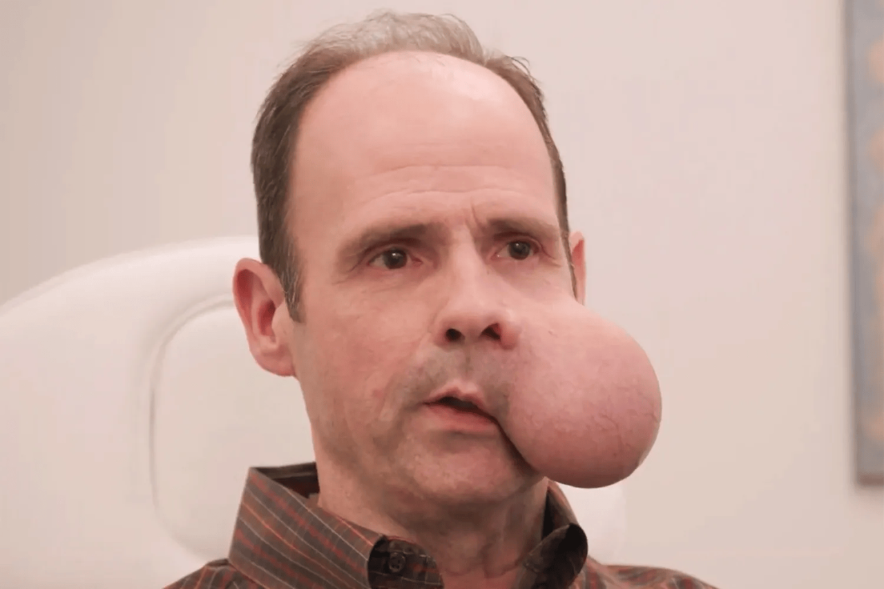 في مشهد مؤلم أثار تعاطف المشاهدين، ظهر رجل يدعى رون في الحلقة الأولى من البرنامج الطبي «About Face» على قناة TLC، وهو يناشد الأطباء مساعدته في إزالة ورم ضخم يزن نحو 4 أرطال غطى جانبا من وجهه على مدى سبع سنوات، بعدما حذره الأطباء من أن استمرار نموه قد يشكل «حكما بالموت» إذا لم يستأصل على الفور.