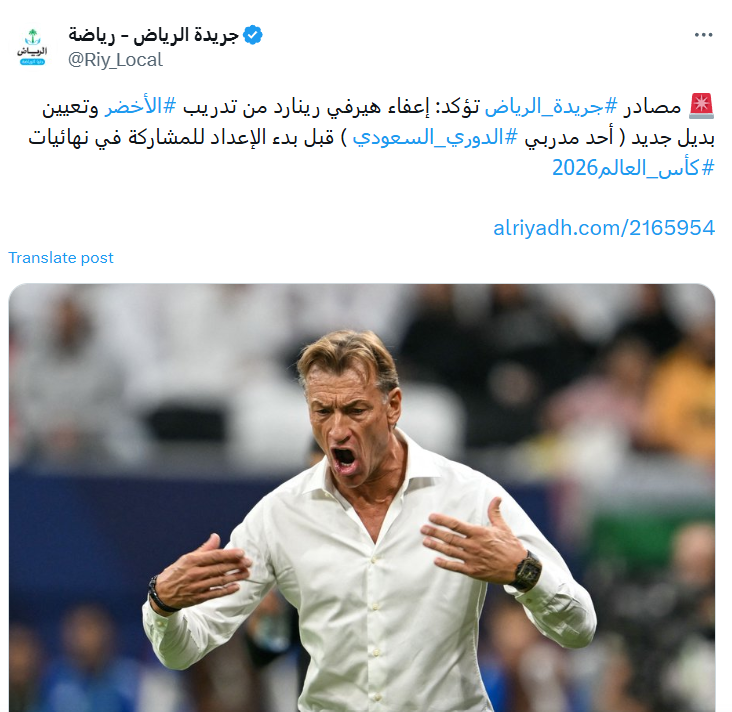 أفادت مصادر إعلامية بوجود توجه داخل مجلس إدارة الاتحاد السعودي لكرة القدم لإحداث تغيير في الجهاز الفني للمنتخب الأول، يشمل إعفاء المدير الفني الفرنسي هيرفي رينارد، والشروع في البحث عن بديل قبل الانطلاق الفعلي لمرحلة الإعداد لنهائيات كأس العالم 2026.