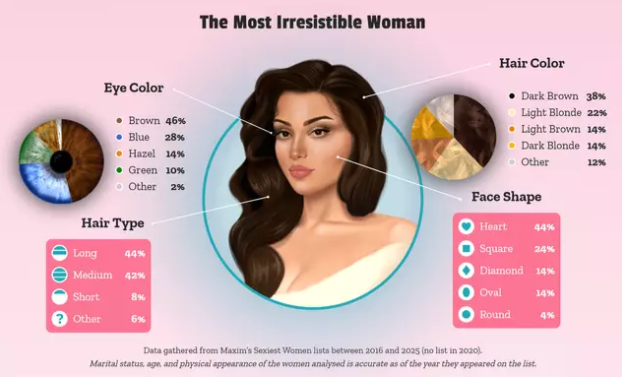 الدراسة أعدتها شركة PlayersTime، واعتمدت على تحليل قوائم «أكثر النساء جاذبية» الصادرة عن مجلة Maxim خلال الفترة من 2016 إلى 2025.