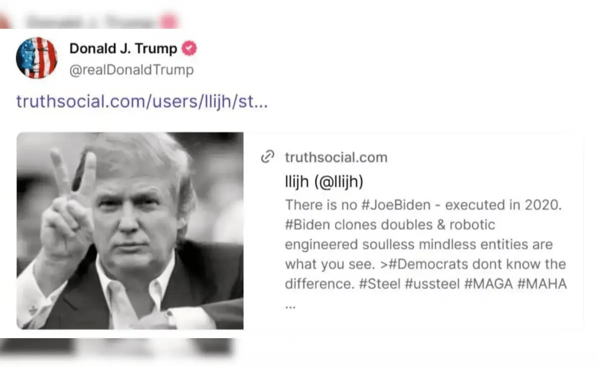 روج ترامب لهذه "النظرية" على منصته "تروث سوشيال" عن طريق إعادة نشرها. أحد المستخدمين لم يصدق الأمر لدرجة أنه كتب: "مستحيل، هل هذا المنشور حقيقي؟". وكان ترامب -وزوجته ميلانيا- قد صرحا بأنهما يشعران بالحزن لسماع خبر إصابة بايدن بسرطان البروستاتا، لكن الرئيس الأمريكي سرعان ما عاد وهاجمه وطالب من الجميع بعدم الشفقة على بايدن لأنه -على حد وصفه- "شخص خبيث!".