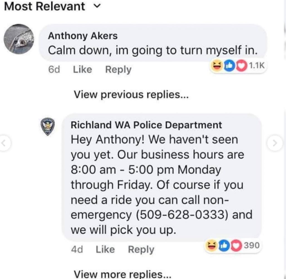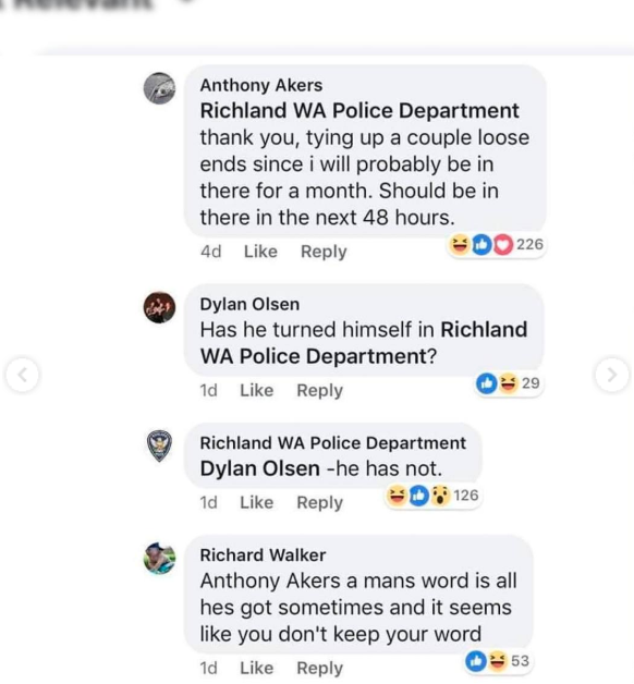 في عام 2018، نشرت شرطة مدينة ريتشلاند في الولايات المتحدة منشورا على فيسبوك ضمن فقرة أسبوعية بعنوان Wanted Wednesday، أعلنت فيه أن أنتوني آكرز (38 عاما) مطلوب للعدالة بسبب عدم الامتثال لأوامر قانونية صادرة عن إدارة الإصلاحيات، وطالبت أي شخص لديه معلومات عنه بالتواصل مع الشرطة.