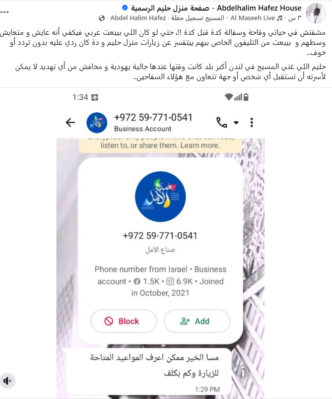أعربت الصفحة الرسمية لمنزل الفنان الراحل عبد الحليم حافظ عن استيائها الشديد بعد تلقيها رسالة عبر أحد تطبيقات التواصل من رقم هاتف تابع لدولة إسرائيل، يتضمن استفسارا حول مواعيد زيارة المنزل وتكلفة الدخول.