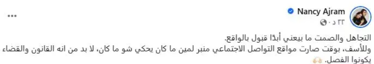 وعلى خلفية هذه الادعاءات، أكدت عجرم أن الصمت لا يعني القبول أو التسليم بالشائعات، مشددة على أن الفيصل الوحيد هو القانون، بقولها: «لا بد أن يكون القانون والقضاء هما الحكم في مواجهة الأخبار المغلوطة».
