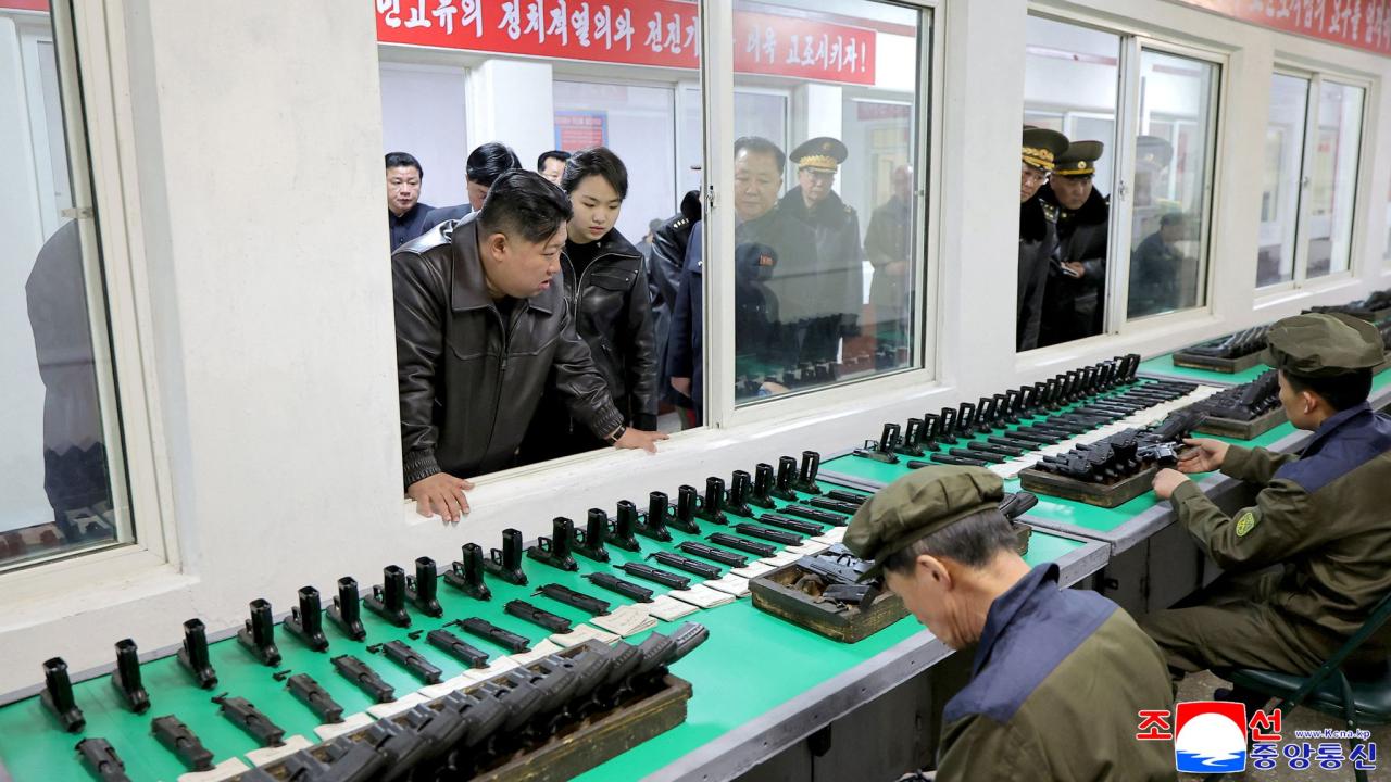وأظهرت الصور التي نشرتها وسائل الإعلام الرسمية الزعيم الكوري الشمالي وابنته وهما يختبران "مسدسا من طراز جديد" خلال تفقدهما مصنعا للذخائر الخفيفة.