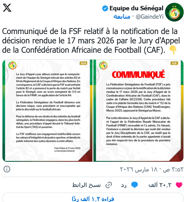وأعلن الاتحاد السنغالي بدء إجراءات الطعن أمام محكمة التحكيم الرياضي في مدينة لوزان بسويسرا، باعتبارها الجهة القضائية الأعلى في النزاعات الرياضية الدولية.