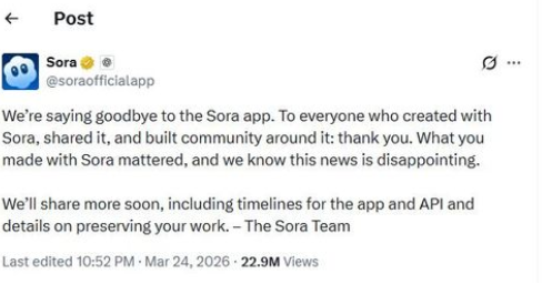 في منشور رسمي، قال حساب "Sora": "نودع Sora... إلى كل من أنشأ وشارك وبنى مجتمعا حوله، شكرا لكم. ما صنعتموه كان مهما، وندرك أن هذا الخبر قد يكون مخيبا للآمال".