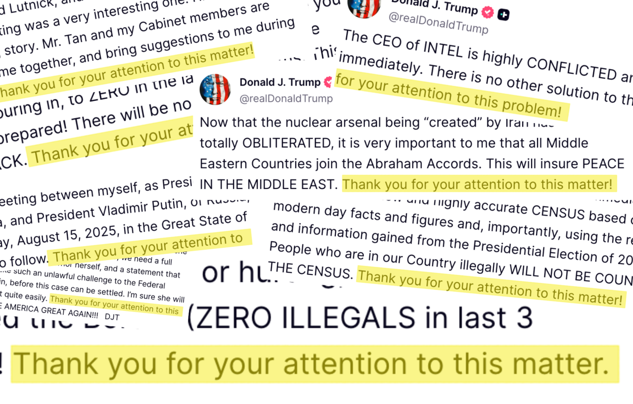أثار الاستخدام المتكرر لعبارة لافتة من قبل الرئيس الأمريكي دونالد ترامب على منصته Truth Social تساؤلات واسعة، بعد أن لاحظ متابعون تكرار جملة: "Thank you for your attention to this matter" (شكرا لاهتمامكم بهذا الأمر) في عدد كبير من منشوراته الرسمية وغير الرسمية.