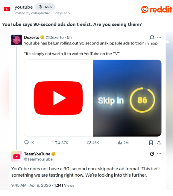 وبحسب ما نقله موقع 9to5Google، أكدت حسابات رسمية تابعة ليوتيوب عبر وسائل التواصل أن المنصة "لا تمتلك صيغة إعلانات غير قابلة للتخطي لمدة 90 ثانية"، مضيفة أن هذا الأمر "ليس قيد الاختبار حاليا"، مع الإشارة إلى أنها تعمل على التحقق من الشكاوى المتزايدة.