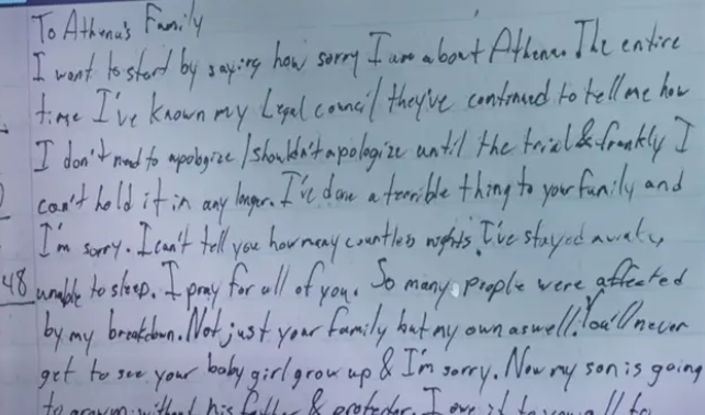 "أعلم أنكم لن تروا ابنتكم تكبر، وأنا آسف… أطلب منكم الصفح، وأتمنى أن تذكروا ابني وتعطوه الرحمة لأنه فقد والده".