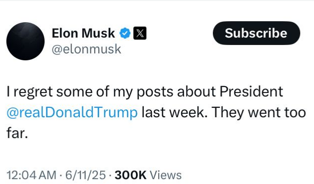 وبعد أيام من الجدل، خرج ماسك اليوم (11 يونيو) ليعبر عن ندمه على تصريحاته، قائلا: